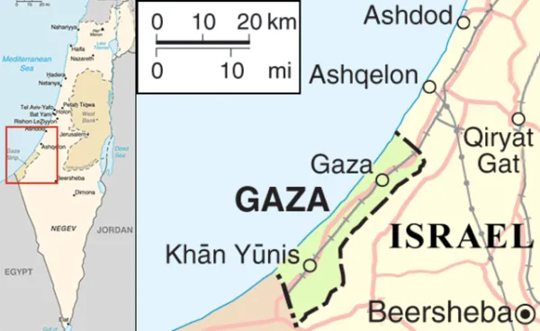 Map of the conflict area around the Gaza strip; Mor, Public domain, via Wikimedia Commons