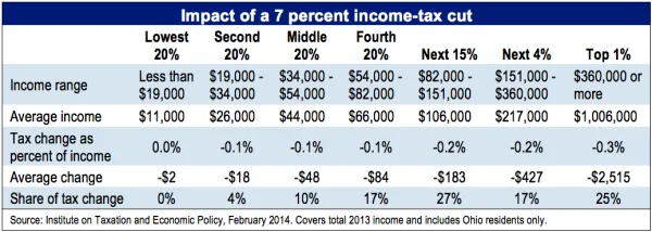 It found that the top 1 percent of Ohio’s taxpayers, who average more than $1 million a year in income, on average would receive a tax cut of $2,515 a year. The middle fifth of taxpayers, who make between $34,000 and $54,000 a year, would average a tax cut of $48, while the lowest fifth of taxpayers would get $2.