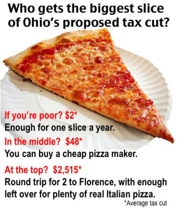 An across-the-board cut in rates favored by Governor John Kasich may allow low-income Ohioans to buy a slice of pizza a year, on average. Those in the middle could purchase a cheap pizza maker, while the state’s most affluent taxpayers could use their cut to go on a round-trip for two to Italy, with money left over to pay the hotel bill and buy some real Italian pizza.