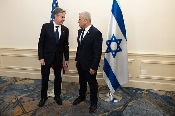 Secretary Antony J. Blinken meets with Israeli Opposition Leader Yair Lapid in Tel Aviv, Israel, November 30, 2023. (Official State Department photo by Chuck Kennedy);  U.S. Department of State, Public domain, via Wikimedia Commons