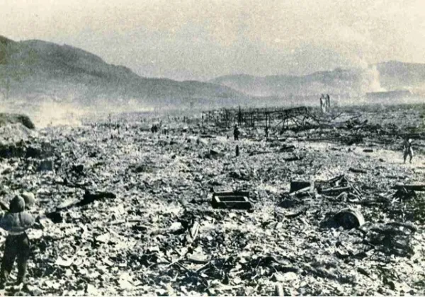 An auctioned photo of the atomic bomb's effects in Nagasaki on August 10, 1945, auctioned in December 2020 (w:Yōsuke Yamahata, Public domain, via Wikimedia Commons)
