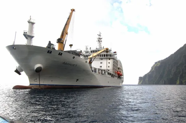 The passenger freighter anchored in the Marquesas Islands, French Polynesia.