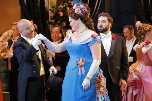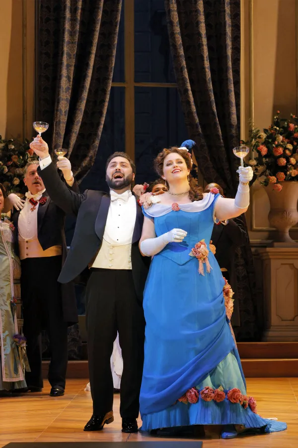 During the revelry, swept up in the ebullient spirit of things, the dashing newcomer Alfredo Germont (Armenian tenor Liparit Avetisyan) jauntily croons the immortal aria “Toast, Let’s Drink from the Joyful Chalices”: