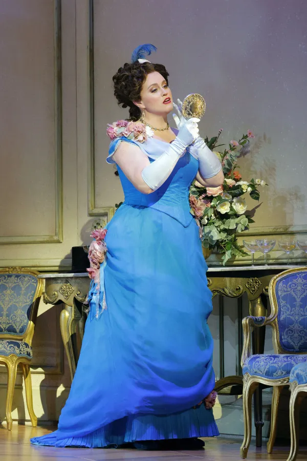 With splendid sumptuous sets and sonorous singing, LA Opera’s risqué revival of Giuseppe Verdi’s La Traviata is a veritable feast for the eyes, ears and senses. Translated from the Italian (the language this opera is sung in, although its action is set in France), the words “La Traviata” mean “The Fallen One,” and the title refers to the not-so-virginal Violetta Valèry (voluptuous soprano Rachel Willis-Sørensen from Washington state), a highly successful Parisian prostitute (who is believed to have been based on an actual escort). The opera opens with a party Violetta is throwing for her exclusive circle of bourgeois pals at her elegant, exquisitely designed, capacious home, replete with chandeliers and wall-to-ceiling windows with excellent views of the City of Light (the dazzling sets and costumes are designed by Englishman Robert Innes Hopkins). The kinky courtesan’s opulent lair is the home that sex built – the world’s oldest profession can certainly be lucrative.