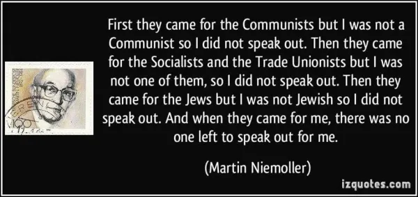 Therefore, in the spirit of Martin Niemoller’s profoundly important message to the oppressed, or the soon-to-be oppressed, activists that are involved in pro-justice movements need to be vocally and physically supportive of each other’s movements. If Big Government and Big Business and Big Media entities are seen to be working to silence somebody else’s justice-seeking movement, they are probably eventually going to be trying to silence yours.