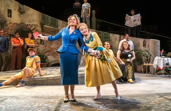 As every viewer of Orpheus, Oedipus Rex, Romeo and Juliet and West Side Story and Harlequin romance reader knows, an essential ingredient in concocting the elixir of a love story is that there must be an obstacle preventing the lovers from being together and/or consummating their all-consuming amour. In Piazza that hurdle is not death, marrying your parent or warring gangs. The relationship that grows between Clara and Fabrizio is complicated by their different cultural backgrounds and lack of a common language (although the latter can help reduce the chitchat and cut to the sexual chase). Although contemporary audiences, who are bombarded with commercials of multi-culti partners are passé about such couplings, in 1960 when this story was published (and judging by factors such as Brigitte Reiffenstuel’s period dress, I suspect the current stage version takes place in the early sixties) inter-ethnic dating was taboo.