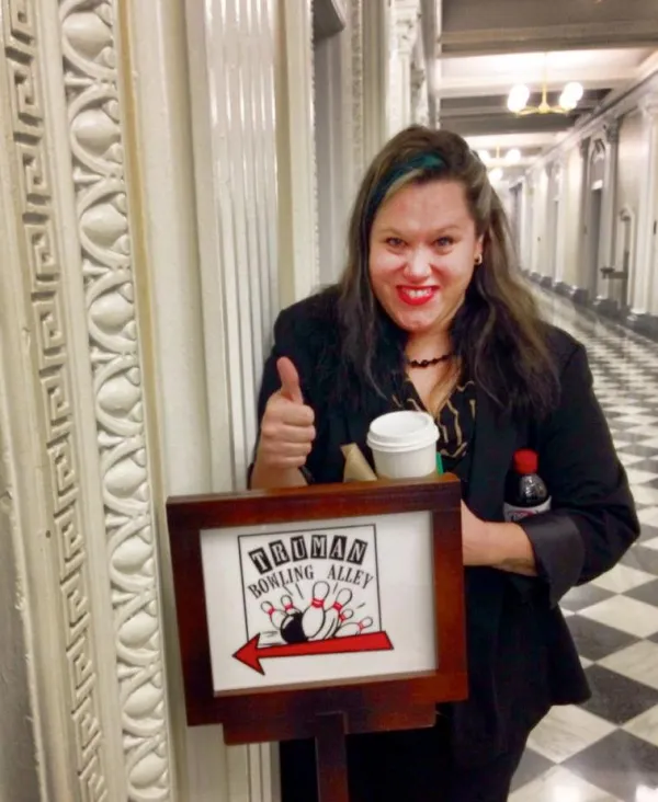 Greetings from Liz Lessner President Obama (brilliantly) assembled a Business Council back in 2010 that engages the small business community nationwide. We were invited to a day long briefing by senior advisers and staffers as well as given the opportunity to voice our small biz concerns to White House staff. Hopefully, Mayor Coleman will one day assemble a Citywide version of this council, as small business concerns are often overlooked in Columbus. The Truman Bowling Alley was not included in this meeting but I was able to sneak in there for a quick peek. Harold and I had our rehearsal dinner in the bowling alley in the basement of Columbus Athletic Club, I got a thing for old timey basement bowling alleys. Thanks! Liz