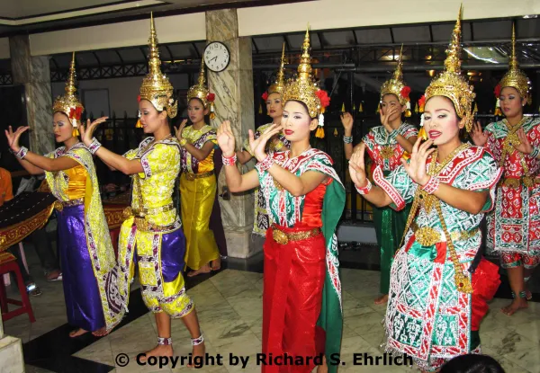 to pray at the gilded Brahman and watch ornately costumed Thai women