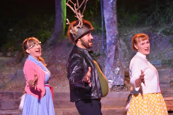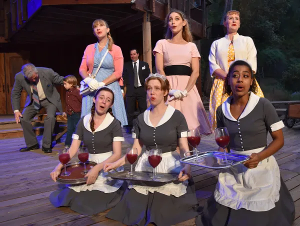 However, this version is the Bard with (literally) a twist: WGTB Artistic Director Ellen Geer has transported the Elizabethan-era, Windsor, England-set play to small town USA in Connecticut, during the1950s. Not only that, but a score of period music has been interjected into the madcap merriment of this modern dress revival, with songs from musicals such as My Fair Lady, South Pacific and Bye Bye Birdie, plus rock ‘’n’ roll hits such as “Rock Around the Clock.”
