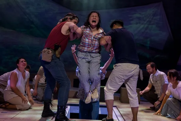 The stage has different levels and trapdoors but is most barely. There are portions of trees on stage right and left, but the tropical ambiance is mostly imbued via projections wrought by Nicholas Santiago. Some of the mise-en-scene is stylized and the POV is related at times via Reggie Lee’s choreography. Perhaps because I sat in the front row seat the play was often too loud and noisy for my tender eardrums.
