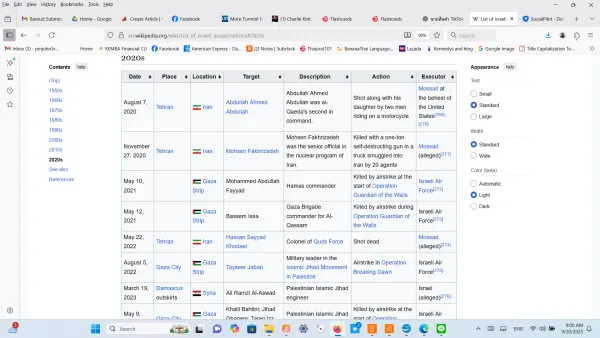 Wikimedia lists Israeli assassinations beginning in the 1950's.  This is a screenshot beginning in 2020.  It would require 5 screenshots to list all, beginning 2020.