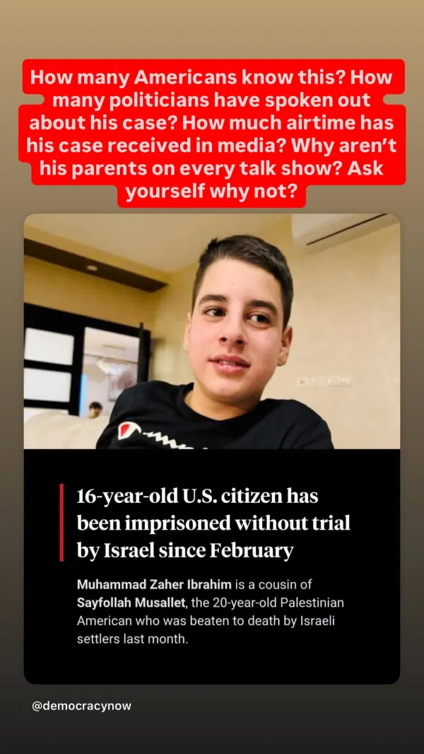 This story should alarm every single American who values our constitutional rights, the basic element of democracy and defending your fellow American who is unfairly treated in a foreign country that claimed to be our closest ally. It is the sad story of Muhammad Ibrahim, a 16 y/o Palestinian American held in Israel without trial since last February.
