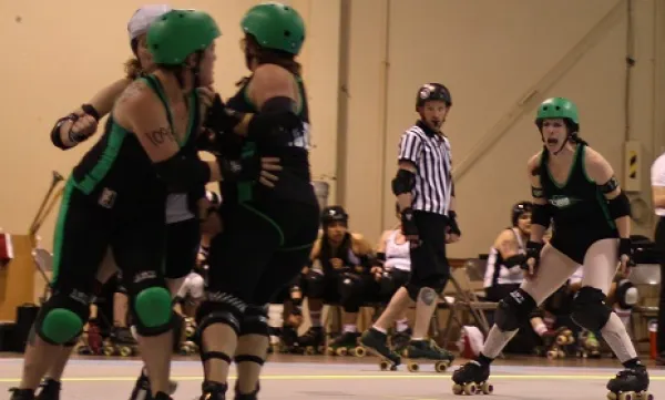 Gang Green's offense seemed content to inch the lead ahead until the tenth jam when lighting struck again. Blitz Lemon took advantage of a track cut penalty to pick up four grand slams and continued her fast pace lapping for three more slams after Plan B's jammer returned from the pine bench. Lemon totaled 13 grand slams on the half as Gang Green kept her in the rotation with three other jammers, Ally McSqueal, Elektra Magneto, and Hop Devil. The speedy quartet combined to create a nearly triple digit lead of 145 to 49 by the end of the half.