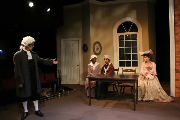 Bet lobbies Sedgwick, a Continental Congress delegate and, as mentioned, a lawyer, to represent her in court, in an effort to gain her freedom from Bet’s “owner,” Col. Ahsley, who is his friend. Finally, at the cost of their friendship, the conflicted Sedgwick rises to the historical occasion and takes Bet’s case, one of America’s early so-called “freedom suits,” setting the stage (literally) for the clash of two courthouse gladiators. During a brief intermission, the stage’s domestic set is rearranged to become a courtroom, and as the proverbial curtain lifts on Act II, the legal battle of the titans, that is the dramatic highlight of this play, commences.