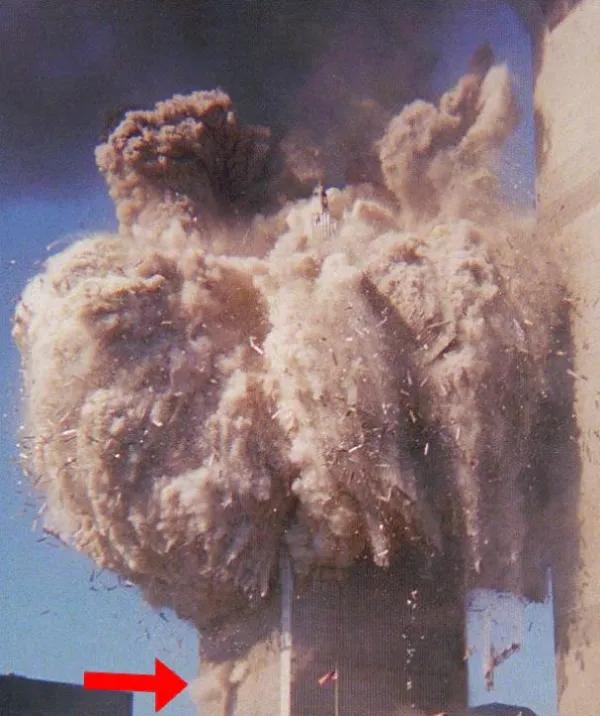 The arrow in the above photo points to an explosive “squib” that proves that there were pre-planted explosive devices that severed, on every floor, the massive internal steel beams and girders so that the doomed building will collapse (or dissolve) entirely into its own footprint in a matter of seconds, thereby minimizing the damage to adjacent buildings (the goal of all controlled demolitions). Note that chunks of the steel beams have been explosively thrown upwards and outwards at high speeds due to the power of the demolition charges that had been planted by unknown co-conspirators in the three buildings over the weeks prior to 9/11/01. All the concrete in WTC Towers 1 & 2 was pulverized into fine dust, and over 600 small chunks of human bone fragments were found on the top of the adjacent Deutsche Bank building two years later.