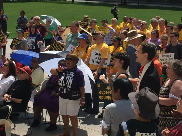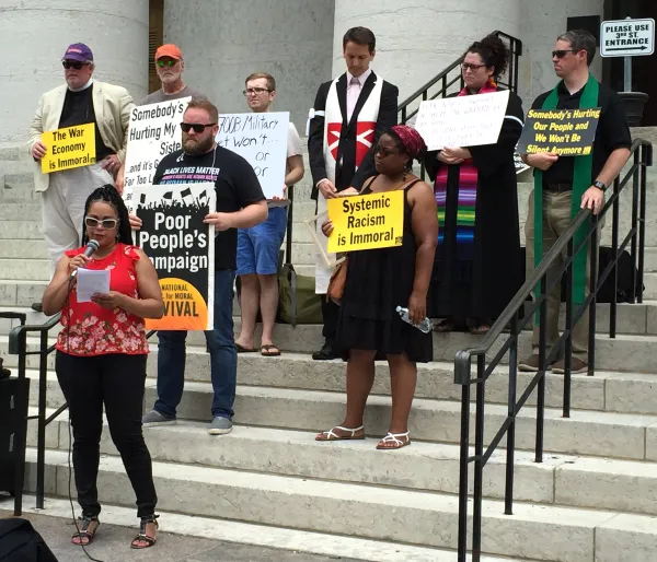 On May 21, the Poor People’s Campaign rally at the Ohio Statehouse linked poverty with systemic racism. “There is a battle going on in America, and the poor are the ones who are under attack,” said Pastor Jason Ridley. “It’s morally wrong to have 140 million people who are living in poverty, not because they are lazy and unwilling to work, but because politicians have blocked living wages and health care, and have undermined union rights. It is morally wrong that the richest one percent in our country own more wealth than the bottom 90 percent combined. It is morally wrong that statehouses across this country block minimum wage increases and the fight for $15, all while passing laws that cut crucial safety net programs.”