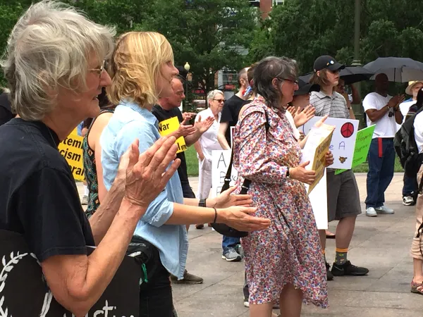 “For far too long, we have operated on a bottom line of money and greed,” said Rabbi Jessica Shimberg. “Just look around you for evidence of that.” She called for “a cultural and spiritual revolution that affirms the dignity and value of each and every one of us, so matter who we are, where we come from, or what we have done.”
