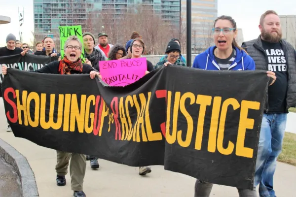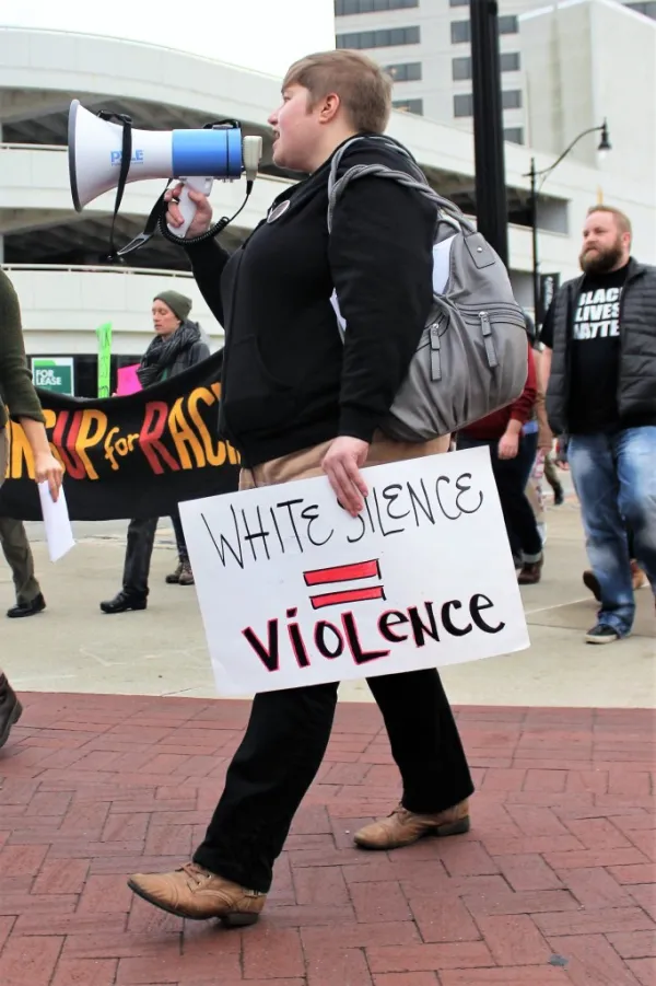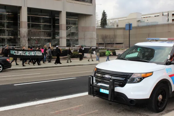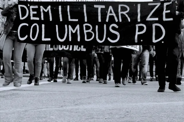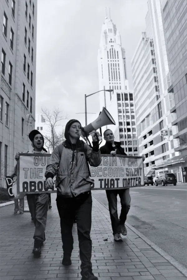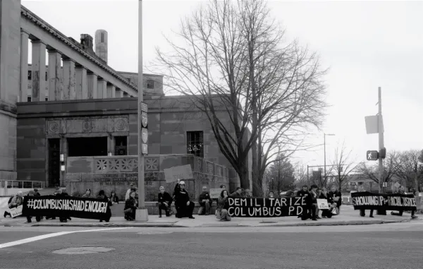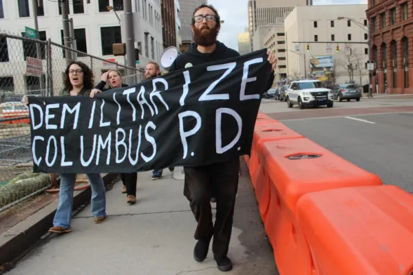 January 20 was marked by protests across the U.S. against the inauguration of Donald Trump. One of several actions in Columbus was a march to the downtown police station and City Hall to call on Mayor Ginther to demilitarize the police force.