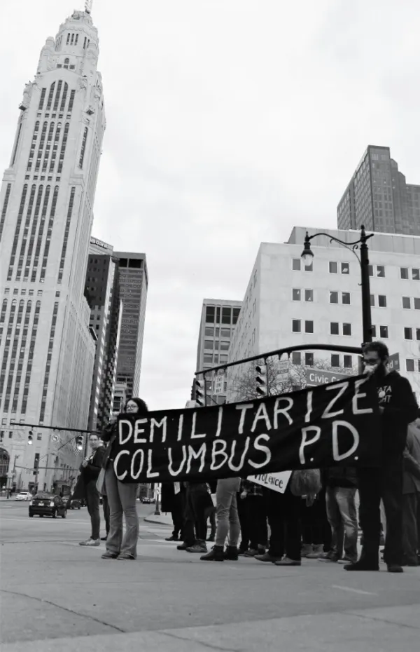 The protesters circled up outside City Hall and used a megaphone to shout their demands: that the city demilitarize its police force, and that the Columbus Police Department return its Long-Range Acoustic Device, or LRAD.