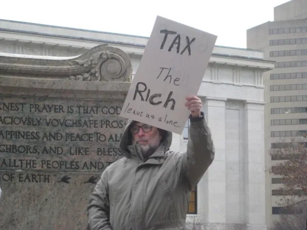 “Tax the greedy, not the needy!” the crowd shouted.