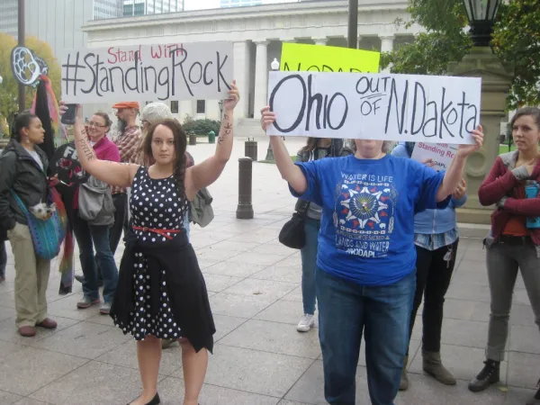 On November 4 supporters of the North Dakota Sioux from across Ohio gathered at the Statehouse to call on Governor Kasich to recall state troopers from Standing Rock. The demonstrators chanted, “Mni Wiconi!” (Lakota for “water is life”).