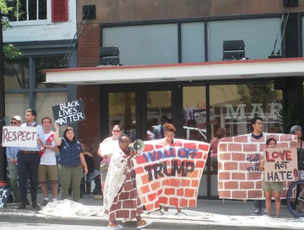 Protest organizer Rubén Castilla Herrera also had a bullhorn. “We’re black, brown, white, queer, straight, immigrants, women, men,” he said. “We’re a diverse community, and we’re to tell you that Trump is not welcome here!”