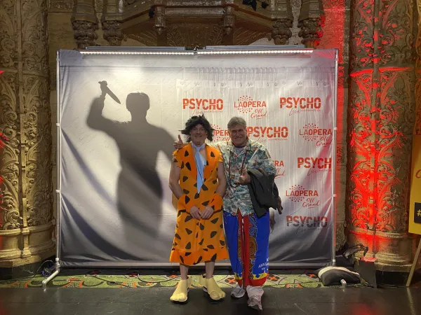 Be that as it may, the final night of LA Opera Off Grand’s screening of Hitchcock’s bloodcurdling masterpiece took place on Halloween, and after the movie a costume party took place in the lobby of the Ace’s Spanish Gothic-style theater. Many Trick or Treaters came dressed up - there were devils, a Popeye and Olive Oyl, at least two males dressed as Mrs. Bates, etc. But my favorites were a woman dressed as Psycho’s bloodstained shower curtain and my childhood pal Skip Sussman, who wore a hilarious Fred Flintstone costume, complete with wig and gigantic faux feet. He went from Hitch and Herrmann to Hanna-Barbera. When Skip-cum-Flintstone parked his car at the Ace the witty valet asked him if there was “a hole in the bottom of his car?” Funnily enough, the costume Skip ordered especially for the event came from Rubie’s, a store in Richmond Hill, Queens near where we both grew up.