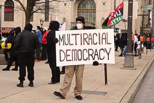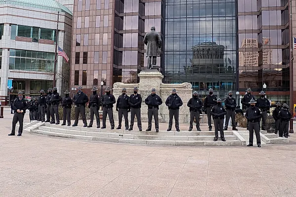 The United Front Against the Far-Right and Capitalist System! march and rally on Inauguration Day started at City Hall then marched across High Street to the Ohio Statehouse. The Ohio Highway State Patrol and the National Guard had the building surrounded with man (and woman) power along with Humvees and patrol vehicles. As speeches were made the "security detail" stared but did not flinch. Signs read “Black Lives Matter” and “We don’t want Biden, we want revenge!” The demonstrators encouraged people to continue the fight against the far right and fascism.