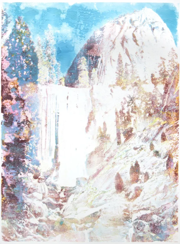 In his Taste Test in Color series he gives a respectful nod to Ansell Adams’s iconic Yosemite photographs, and pushes the boundaries of what can be used for pigment in a photograph. CMA displays three of his works from this series. Each are the same photograph of Vernal Falls in Yosemite, printed with various edible ingredients in a CMYK or RGB color model. He uses Kool-Aid, bubble gum, and gummy bears as his pigments and pulls them through the silkscreen to print the image. Each material responds differently to the silk screen process creating a variety of streaks, marks and texture. The images are colorful, fun and playful, but again it leads me to think about how strong the chemicals found in these foods can be. It also raises the contrast of stunningly beautiful natural landscapes during Adam’s time being corrupted by the superficiality of modern consumption.