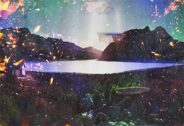 The exhibition shows an assortment of works representing the variety of experimental photo processes used by Brandt. In Lakes and Reservoirs, Brandt traveled throughout the country taking photographs of lakes and reservoirs in nearly a dozen different states. He would develop the beautiful landscapes on large scale color photo paper and then submerge them in the lake water they capture. The photos were submerged for days, weeks, or even months. Once finally removed from the water a new landscape is revealed, distorted, speckled and stained.