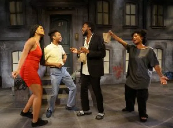 Act I is set in Brooklyn’s Bedford-Stuyvesant (where I was born and attended fifth grade), America’s largest Black community, as four traumatized friends at a tenement lament Forest Winthrop’s (an offstage presence) demise months after the promising football player’s death at NYPD’s hands. Hanging out on the stoop, Jean-Baptiste Delacroix (Tyrin Niles, who had recurring roles in the BET series American Soul and Tyler Perry Studios’ Meet the Browns), who is of Haitian background, clashes with visiting Calvin Young (Ahkei Togun) because he has committed the unpardonable sin of moving away from the Bed-Stuy ’hood where they grew up to better himself by attending (and living near) Columbia University in Manhattan. It seems like the old crabs-in-the-bucket syndrome is at play here. And Jean-Baptiste appears to be a shiftless, pot smoking, ne’er-do-well “Blacker” (stereotypical Black slacker, to coin a phrase), but in fact he is an aspiring rapper and poet.