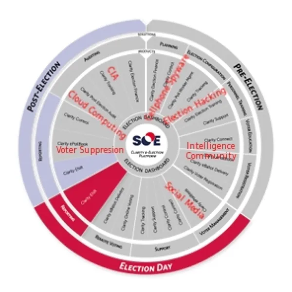 Scytl's 2012 entry into the American election market occurred through the purchase of SOE software, a Tampa based manufacturer of election management and reporting software known as the Clarity suite. Scytl initially maintained essentially a front address in Virginia while digesting SOE during the the 2012 election cycle. Since then there has been a pattern of SOE rebranding and reorganizing itself along with a merger and new set of strategic partnerships.