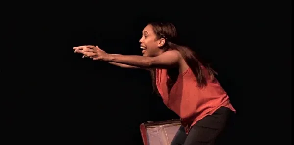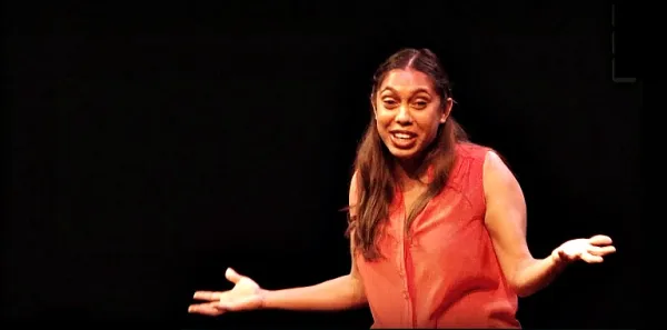 We also see our storyteller, Chenoa Deemal, a full-figured, pretty, youthful brown-skinned woman with long straight hair in a colorful dress. A sort of Down Under counterpart to African griots, Ms. Deemal proceeds to lead us through seven vignettes that shed light on the Aboriginal experience, after she has recognized the Traditional Custodians of the land here in Los Angeles - the Gabrielina, Tongva and Kich tribal peoples.