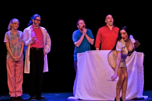 The final skit, The Penis Mightier, has the dual distinction of boasting the most ingenious premise and the most elaborate prop. It features Whitehouse as an accident victim who wakes up to learn an eccentric professor (JT Walker III) has replaced his damaged “junk” with a huge bionic substitute that has the unique ability to ferret out “sluts.” A few snickering laughs result, but the piece would be funnier if it didn’t rely, like much of the show, on juvenile attitudes toward this most adult of topics.