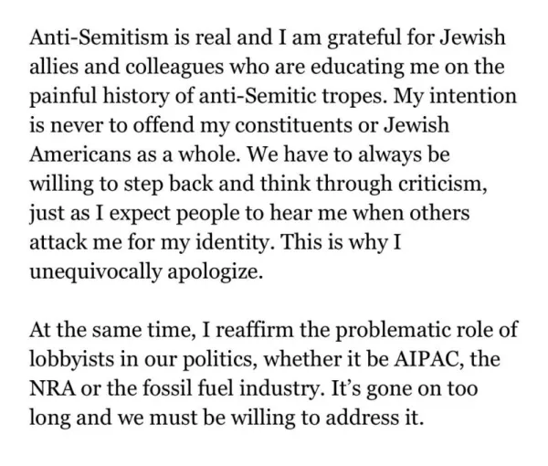 “We are and will always be strong supporters of Israel in Congress because we understand that our support is based on shared values and strategic interests. Legitimate criticism of Israel’s policies is protected by the values of free speech and democratic debate that the United States and Israel share. But Congresswoman Omar’s use of anti-Semitic tropes and prejudicial accusations about Israel’s supporters is deeply offensive. We condemn these remarks and we call upon Congresswoman Omar to immediately apologize for these hurtful comments.