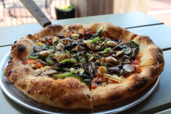 Harvest Pizzeria has the best vegan pizza crust in town. I love this place for so many reasons. Their motto is LOCAL TASTES BETTER, and I agree, especially when it is organic, and I look forward to the day it all becomes veganic. Their website features some of the local farms from where they source their ingredients. When I spoke with the staff, they informed me that they are also highly conscious about recycling everything possible, even their “to-go” containers are made of recycled products. No Styrofoam (I can’t stand Styrofoam!). When I go, it is typically for lunch because of the lunch special pricing. The outdoor seating is enjoyable in the seasons you want to be outside (clearly not right now). I typically order the vegetable pizza, hold the cheeses and onion and tomato sauce, and substitute them for, vegan pesto, artichokes, basil, Marcona style almonds and when they have it, balsamic reduction. OH. MY. GAWD. I’m drooling thinking about one right now. They also offer a gluten-free pizza and sell some other locally produced products such as pasta. If you have a penchant for unique libations, Curio is right next door.