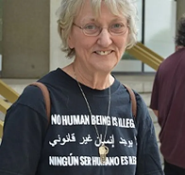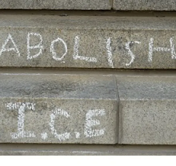 White woman in Black Lives Matter Tshirt holding a sign that says ICE murders