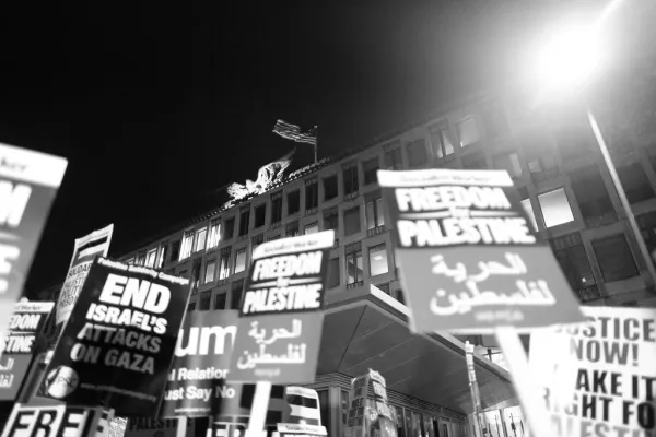 "US Embassy in London besieged by protesters angry at the US defiance of world opinion and international law with its decision to move its embassy to Jerusalem" by alisdare1 is licensed under CC BY-SA 2.0.