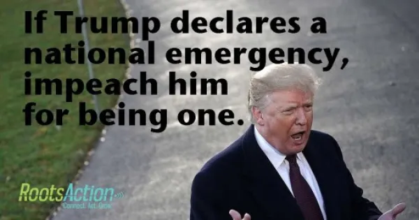 Trump wants to declare a national emergency, to unconstitutionally spend money contrary to the will of Congress, to unconstitutionally use military force domestically, to once and for all abandon the pretense that there is anything left of Congress beyond a gaggle of court jesters — and all to build an actual monument to absurd and hateful campaign propaganda. That, and not anything south of Texas, is a national, and global, emergency. Once Trump has seized that power, it will belong to him and be cheered by his devotees, and to the next president if we make it that far, at which point it will be cheered by that person’s devotees.