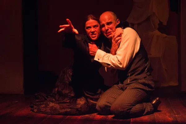 In one of the most fortuitous improv moments I’ve ever witnessed on the boards, when The Woman meets 10-year-old Miles (Spann plays the lad) Sulzberger’s Victorian dress came undone. Miles, who is older (if not wiser) than his years, spontaneously fixed Sulzberger’s costume. Director Don K. Williams later insisted that this was not in Hatcher’s script, but it melded perfectly with the theme of child sexuality in this story with its Lord of the Flies-like libidinal resonance. Quite a moment of spontaneous onstage serendipity indeed. (As Freud wrote in 1920’s The Psychology of Errors: “There is no such thing as errors.”