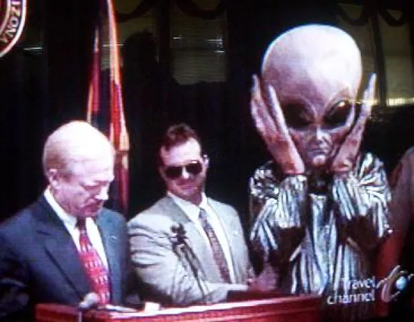 Take as an example what happened in Arizona in the aftermath of the so-called Phoenix Lights incident of 1997, in which thousands of witnesses claimed to have observed a huge carpenter's square-shaped UFO, containing five spherical lights or possibly light-emitting engines. Among the witnesses was then Arizona governor Fife Symington III, who held a press conference soon after the event. During that press conference, Symington stated that "they found who was responsible." He then proceeded to make light of the situation by bringing his aide on stage dressed in an alien costume.