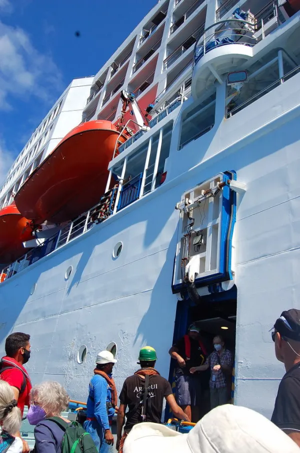 A barge has been lowered into the pitching ocean. The door – which has protected the hatch like a force shield on a rocket protects it from heat upon reentering the atmosphere – has been vertically lifted. All conditions are go, as passengers carefully file, one-by-one, through the hatchway, where they are greeted by Aranui’s agile, brave, brawny crewmen, who acrobatically assist their precious cargo into securely boarding the waiting boat, which heaves up and down as if at a liquidy rodeo. We’re ready to blast off!