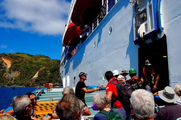 Now, Dear Reader, you may feel that I’m being hyperbolic in comparing the process of arriving at Pitcairn to the 12 Labors of Hercules. But even after an odyssey of thousands of miles that had been delayed almost three years due to the pandemic, receiving the seal of approval for my health and finally the official seal of arrival on my passport, a truly Herculean effort awaits us before we can set forth on Pitcairn. That night we experience the roughest seas of our voyage so far. The waves are rocking and rolling and passengers – including your erstwhile scribe – are repeatedly awakened by the turbulence.