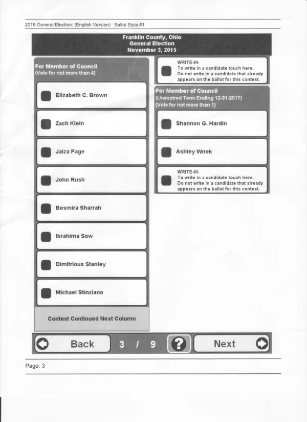 Mr. Motil went to the Franklin County Board of Elections headquarters on Morse Road early this afternoon and requested a picture of what the entire ballot page with his race on it looked like. After reviewing the page with an election official it became clear that the Write-In button for the field race could have easily replaced the box at the bottom of the page that reads, “Contest Continued Next Column”. Instead the Write-In box for the field race was placed directly above the section reading, For Member of Council, (Unexpired Term Ending 12-31-2017) (Vote for not more than 1)”. Motil says, “At the very least a space should have been provided to distinguish between the two races where the Write-In box is at the top right corner and the “For Member of Council” box directly below it. Mr. Motil was directed to call Franklin County Board of Elections Director Bill Anthony who has not returned his calls. Motil will be filing a complaint with the Franklin County Board of Elections and or the Ohio Secretary of State’s Office.