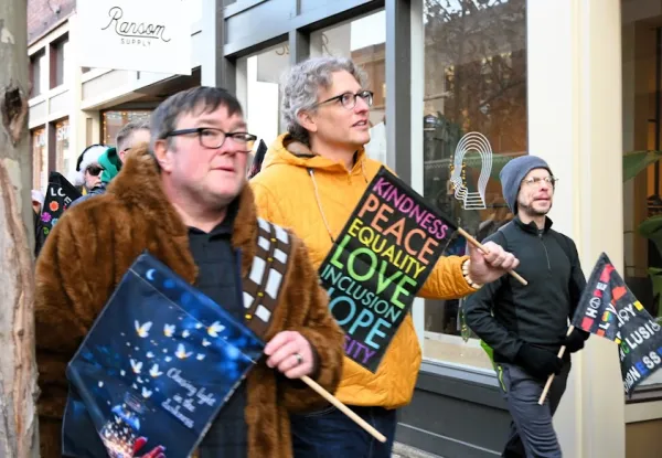 Dozens of people from across the city gathered in the Columbus Short North district on a cold December afternoon to show the world that “Hate has no home here”.
