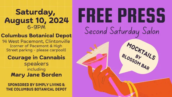 The August Free Press Second Saturday Salon is tonight from 6-9pm at the Columbus Botanical Depot's event spacee at Pacemont and High Street in Clintonville. The actual address, 14 W. Pacemont is a dispensary which will be open tonight until 8pm.