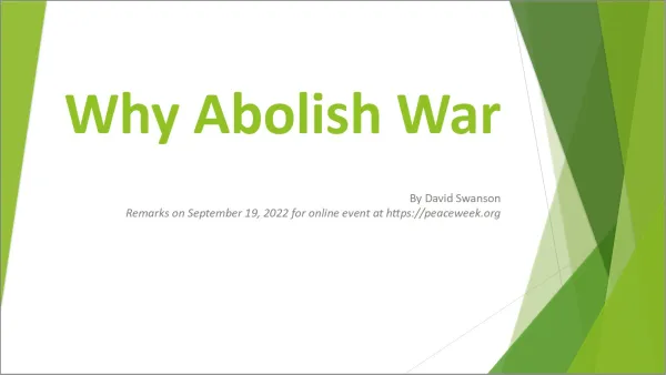 Thank you for including us. After I speak, World BEYOND War Education Director Phill Gittins will discuss the educational work that can move us away from war, and World BEYOND War Canada Organizer Maya Garfinkel will discuss the nonviolent activism that can do the same. This way, I can talk just about the easy part, which is why we should abolish war.