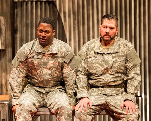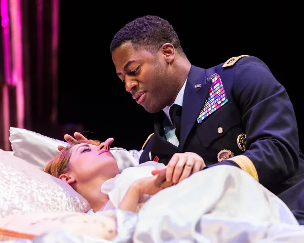 Is the Caucasian Iago’s (Michael Manuel) treacherous turning of the Black Othello (Wayne T. Carr) against the honey color-haired, “alabaster”-skinned Venetian upper cruster Desdemona (Angela Gulner) a hate crime? Othello - a Moor (a North African, presumably Muslim) whose courage in combat and military prowess on behalf of Venice’s city-state has led the Venetian ruling class to promote the nonwhite outsider to high-ranking positions of power - is referred to with racial slurs. The disreputable dolt Roderigo (played with Jeremy Rabb’s usual comic panache) refers to Othello as “thick lips” and “an old black ram.”
