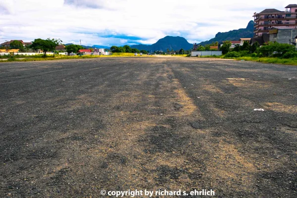 Lima Site 6, set among Vang Vieng's jagged karst mountain peaks, is now a deserted stretch of black asphalt speckled with squashed trash.Photo copyright Richard S. Ehrlich